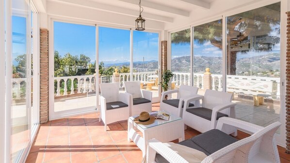 Sous la véranda vitrée, vous trouverez une table à manger et un coin chill-out, vous permettant ainsi de profiter de la vue même pendant les mois les plus frais.