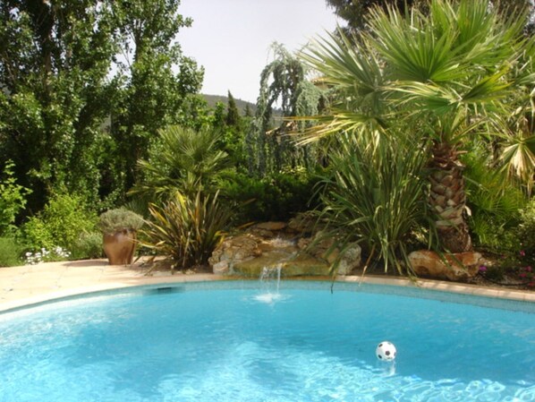 DER TRADITIONELLE SCHWIMMBAD ist landschaftlich gestaltet (mit hübschem Wasserfall) und hat eine Oberfläche von 12 x 5,5 m, ein kleines Bad (1 m) und ein großes Bad (2 m). Es wird automatisch gepflegt und gesichert. Nachts können Sie die automatische Beleuchtung nutzen, um das Bad unter dem Sternenhimmel zu verlängern.