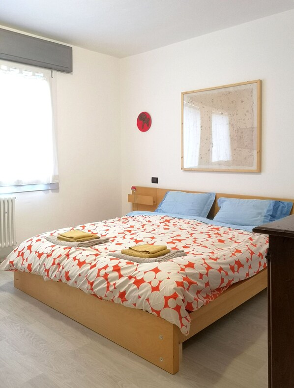 - chambre avec 2 lits simples avec matelas à mémoire de forme, grande armoire à portes coulissantes et meuble bas en bois d'époque.