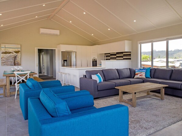 Cette maison de vacances à Whitianga, sur 2 étages, comprend une pièce à vivre ouverte et moderne avec une vue magnifique sur les cours d’eau. L'espace de vie confortable est l'endroit idéal pour se détendre et admirer le paysage, avec de grandes fenêtres pour laisser entrer ... Pour le lieu estival parfait, profitez du pont pour les barbecues! Un deuxième salon, salle à manger et coin cuisine au rez-de-chaussée assure une excellente installation de groupe, avec un écoulement facile vers l’extérieur sur le patio.